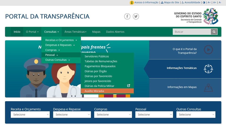 Já está disponível no Portal da Transparência do Estado a consulta em um link específico sobre os servidores que recebem auxílio-moradia no Poder Executivo. Para ter acesso aos dados, basta entrar no portal (www.transparencia.es.gov.br) e clicar primeiramente no menu “consultas”. Em seguida, em “pessoal”, onde a opção “auxílio-moradia” aparece na cor laranja, para destacar que se trata de uma nova opção disponibilizada.
